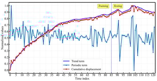 Landslide deformation represents a highly complex, nonlinear dynamic process, influenced by a confluence of internal geological conditions and environmental factors [7,13]. Typically, the time series of cumulative landslide displacement is decomposable into two distinct components: