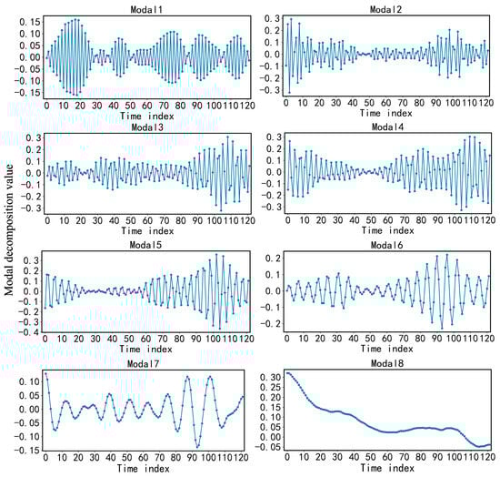 Furthermore, in this research, variational mode decomposition was applied to process the extracted fluctuating term components. Upon analyzing the central frequency values, a marginal difference was noted between the results using 8 and 9 intrinsic mode functions (IMFs). Balancing the factors of computational efficiency and the precision required for accurate predictions, the decision was made to proceed with 8 IMFs for the mode decomposition. The outcomes of this mode decomposition are illustrated in Figure 8 while Table 1 displays the central frequency values resultant from the overall mode decomposition.