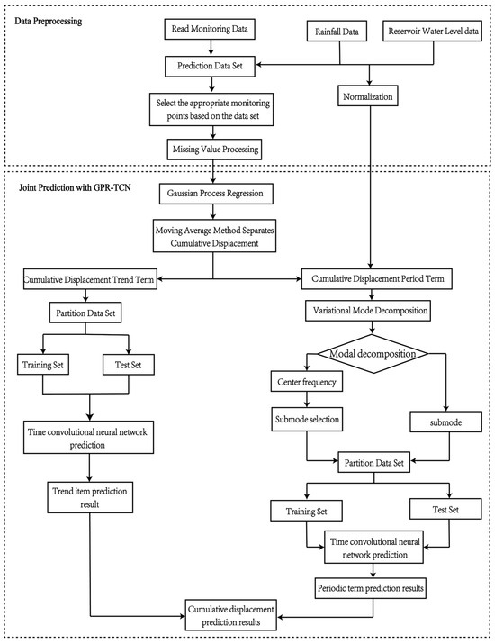 The combination of Gaussian Process Regression (GPR) and Temporal Convolutional Network (TCN) forms a powerful framework for data processing and prediction. GPR fills in missing values, providing a more complete and accurate input for subsequent predictions. The TCN, as a robust model for time-series data, can train and predict on this enhanced dataset, yielding more reliable predictions for slope behavior. The normalization of rainfall and reservoir water-level data reduces the impact of different data magnitudes on the final prediction results. The specific research workflow is illustrated in Figure 9.