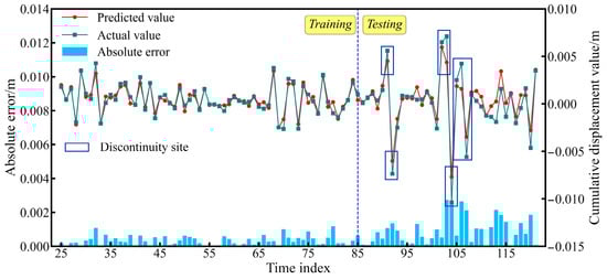 Figure 10 and Figure 11 and Table 2 shows that the prediction accuracy of the GTCN and GGRU is significantly superior to that of the UP-TCN. The discrete index mapping continuous time to integer steps is termed the time index. It is noteworthy that near time index t = 105 (corresponding to the reservoir water-level sudden drop event in July 2013), due to high-frequency oscillations in the displacement sequence, the prediction errors of both models increase. In contrast, the UP-TCN fails to consider temporal correlations during missing value imputation, resulting in phase distortion of periodic components and significant deviation of predictions from measured values (Figure 12).