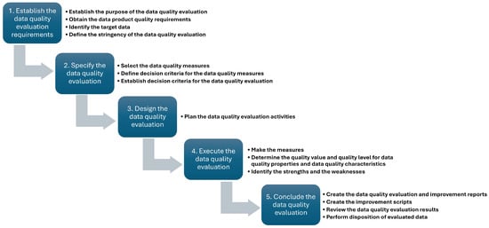 Five-phase data quality assessment process based on ISO/IEC 25024. This framework outlines the sequential stages of requirement establishment, metric specification, evaluation design, execution, and conclusion. It serves as a structured methodology for ensuring systematic and repeatable data quality evaluation across domains.