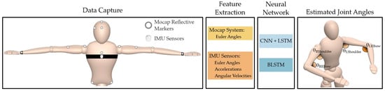Proposed framework for upper limb joint angle estimation using a reduced number of IMU sensors. Both CNN + LSTM and BLSTM were compared using the same dataset.