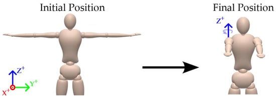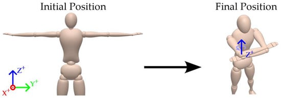 At the beginning of each recording session, the subject adopted a T-pose posture, with both arms extended horizontally and palms facing downward. This standardized position served as the initial reference for all subsequent movements and was used to align the coordinate systems of the IMU and MoCap data. Starting from a well-defined T-pose ensured consistent orientation across both systems and facilitated the synchronization of reference frames during post-processing.