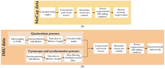 Data preprocessing pipeline for the proposed framework. (a) Describes the processing of MoCap data used to generate the target joint angles for the neural networks. (b) Describes the processing of IMU signals.