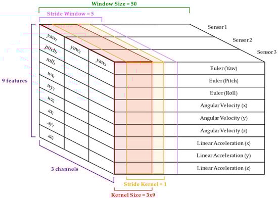 Input tensor representation used in the CNN-LSTM architecture. The input consists of a window of 50 and 9 features per sensor, including Euler angles, angular velocities, and linear accelerations.