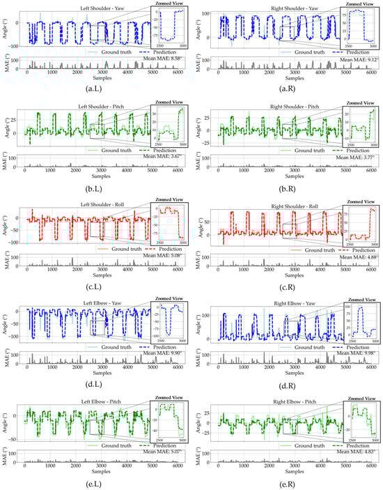 Figure 10 shows the model’s predictions for the three movements mentioned previously for the CNN-LSTM. The presented CNN-LSTM model demonstrates robust performance in predicting joint angles using only wrist and chest sensor data, achieving consistent prediction accuracy across multiple degrees of freedom. For both upper limbs, the model exhibits high precision in estimating planar movements, with shoulder Pitch errors as low as 3.67° (left) and 3.77° (right), and Roll errors measuring 5.08° (left) and 4.88° (right). These results indicate adequate capability in capturing fundamental movement patterns with satisfactory accuracy. Rotational (Yaw) predictions show slightly higher but still adequate performance, with shoulder errors of 8.58° (left) and 9.12° (right), and elbow errors of 9.90° (left) and 9.98° (right), this is considered satisfactory given the complexity of rotational kinematics and the minimal sensor configuration. The consistent performance across both limbs demonstrates the model’s generalization capabilities. The close correspondence between predictions and ground truth throughout most movement phases highlights the effectiveness of the CNN-LSTM architecture in learning meaningful spatiotemporal relationships from limited distal sensor data. It is important to note the model’s ability to accurately reconstruct proximal joint angles without direct measurements from shoulders or elbows, showcasing advanced pattern recognition capabilities.