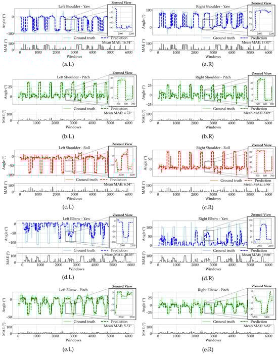 Figure 11 shows the model’s predictions for the three movements mentioned previously for the BLSTM. The BLSTM network demonstrates effective performance in predicting joint angles from limited sensor data, with particularly strong results for certain movement types. For the right shoulder, the model achieves acceptable accuracy in Pitch estimation (MAE: 5.09°) and maintains good performance for Roll movements (MAE: 5.98°). The elbow Pitch predictions also show competitive results with an MAE of 6.82°. While the Yaw predictions for both shoulder (MAE: 17.07°) and elbow (MAE: 19.66°) exhibit higher error values, these results remain significant given the inherent complexity of rotational kinematics and the minimal sensor configuration. The consistent performance across different joint angles highlights the model’s ability to capture fundamental movement patterns, with particularly accurate tracking of planar motions. The prediction curves closely follow the ground truth, highlighting the BLSTM’s ability to capture temporal dependencies. Notably, it reconstructs proximal joint angles using only wrist and chest sensors, demonstrating strong pattern recognition despite the limited sensor setup.