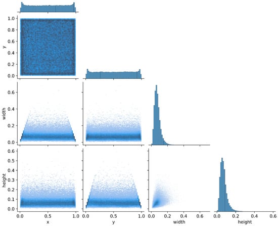 Figure 1 illustrates the distribution of the center points (x, y), widths, and heights of the rectangular boxes. The center points (x, y) are relatively uniformly distributed across the image, indicating a lack of distinct target concentration areas and a more dispersed distribution. The widths and heights are predominantly concentrated within smaller numerical ranges, with the heights exhibiting a near-normal distribution around a mean value, while the widths have a broader distribution but are still predominantly small. This suggests that the dataset contains targets of varying sizes, with most being relatively small and randomly positioned without significant spatial clustering.