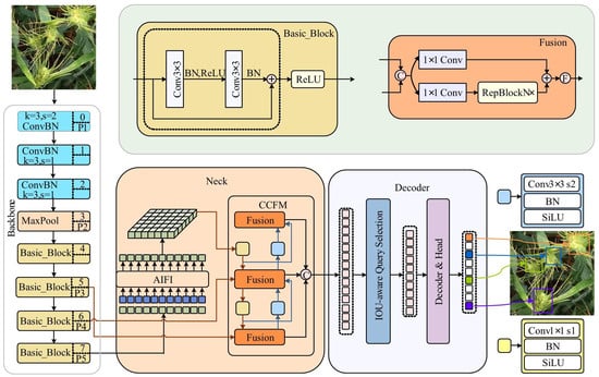 Detection Transformer (DETR) is the first deep learning model to apply the Transformer architecture to the field of object detection. It reframes the task as a sequence prediction problem, drawing inspiration from the Transformer’s encoder–decoder structure and bipartite graph-based matching strategy, while abandoning the non-maximum suppression (NMS) post-processing step. Compared to the YOLO series of algorithms that incorporate NMS post-processing, DETR not only offers lower optimization complexity but also offers greater robustness. However, it suffers from issues such as a large number of parameters and slow convergence, making it challenging to achieve good real-time detection performance in complex tasks. RT-DETR is a novel real-time end-to-end object detection model developed based on DETR. Compared to the YOLO series, it has stronger global feature modeling capabilities that can effectively capture the relationships between objects. In complex scenarios such as detecting closely arranged wheat targets, it demonstrates stronger robustness and better detection performance.