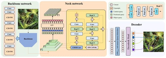 As shown in Figure 2, the RT-DETR architecture mainly consists of three parts: a backbone network, a hybrid encoder, and a decoder. The backbone network uses a convolutional neural network to extract three output features of different scales, namely, 8, 16, and 32.The hybrid encoder decouples intra-scale interactions and cross-scale fusion to effectively process multi-scale features, with the features from the last three layers S3, S4, and S5 serving as encoder inputs. Specifically, the Attention-based Intra-scale Feature Interaction (AIFI) module is used to process high-level features, reducing computational load and improving speed without compromising performance. Meanwhile, the Cross-scale Feature Fusion Module (CCFM) based on convolutional neural networks is employed for multi-scale integration and interaction, converting multi-scale features into a sequence representation of image features. The decoder employs a multi-layer Transformer denoising decoder, which obtains initial object queries from an IoU-aware query selection mechanism and iteratively optimizes them. This mechanism dynamically adjusts queries based on the IoU metric to focus on regions most relevant to the detected targets, improving the quality of bidirectional matching samples and accelerating training convergence. Additionally, it allows for flexible adjustment of the inference speed by changing the number of decoder layers, without the need for retraining. In summary, the RT-DETR model holds great potential for development in the field of object detection in agriculture and complex scenarios.