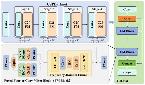 The global wheat dataset is usually characterized by the difficulties in distinguishing wheat from the background in complex backgrounds, large scale differences in the wheat to be tested, strong irregularities, and the presence of many small targets. The C2f structure retains the rich gradient information through the multi-residual connection, but when dealing with highly complex and textured images, its traditional bottleneck structure is limited by the local spatial domain convolution. The traditional bottleneck structure is limited by the limited sensory field of the local spatial domain convolution, which makes it difficult to effectively capture global high-frequency features and low-frequency semantic information. For this reason, this paper proposes a novel Fused Fourier Convolution Mixer (FM) module, which replaces the bottleneck structure in the original C2f, and constructs the C2f-FM module. Gao et al. proposed the Fused Fourier Convolution Mixer (FM) module for efficient global modeling by transforming the spatial domain features to the frequency domain using the discrete Fourier transform (DFT). The method not only retains the global feature perception capability but also avoids the high computational overhead in the self-attention mechanism. Since the background of the field wheat and the object to be measured have significant and stable feature distributions in the frequency domain, they have more obvious differences. The FM module deeply integrates the Fast Fourier Transform (FFT) with the hybrid convolution mechanism in the frequency domain–space domain, aiming to enhance the multi-scale feature characterization capability in complex scenes through the synergistic optimization of the global modeling in the frequency domain and the local feature enhancement. The right side of Figure 4 illustrates the basic principle of C2f-FM. Inspired by the FM module, in order to achieve deep perception of global feature information, as well as a more efficient network model and to reduce the amount of floating-point calculations, the FM module is integrated with the Fourier convolution mixer and C2f. Through spatial domain and frequency domain splicing to realize hybrid feature extraction to enhance the feature extraction ability of wheat to be tested in complex scenes, its specific processing flow is as follows.