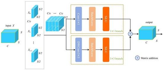In order to control the model’s computation while introducing shallow high-resolution features, this paper proposes a lightweight shallow feature compression module, GHSDConv, as shown in Figure 5. The module firstly performs a Space-to-Depth (SPD) operation on the high-resolution feature maps output from the second stage in the backbone network. The SPD operation rearranges the local structural information in the spatial dimension to the channel dimension so as to obtain the spatial scale matching with the deep features of the backbone without losing the detail information, which is conducive to the subsequent feature fusion. Subsequently, in order to reduce the redundancy of convolutional computation, a dual-stream GhostConv is used, which is a module that decouples the features into main paths and ghost paths, with the main paths firstly generating a portion of the main features through a small amount of standard convolution and the ghost paths generating the complementary features using depth-separable convolution; after fusion of the dual-stream paths, the later selects the 1 × 1 convolution kernel for applying standard convolutional operations to the rearranged tensor. The specific process can be expressed as