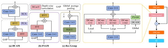 In order to enhance the model’s ability to express different sensory field features, this paper further designs a multi-path fusion structure—CSPDWOK—to fuse feature maps at different scales. The specific network structure is shown in Figure 6. The design of this module is inspired by the CSP structure, which splits the original channel into two paths, ok_branch and identity, and the data in the ok_branch path are processed by Depth-wise Separable Convolution (DSConv) and then transformed by OmniKernel; followng this, the data are spliced into two paths. The data are bipath-spliced and then passed through the Depth-wise Separable Convolution with SE attention. The OmniKernel structure incorporates global, large-scale, and local branches through a parallel three-branch design to model global, local, and medium-sense wild feature representations, respectively, and reduces resource overhead through a lightweight design. GlobalPath: Dual-domain attention is introduced to integrate spatial attention and channel attention to strengthen the model’s ability to model large-scale targets and the contextual semantics of the whole map. Large Kernel Path: The network adopts different shapes of large-scale DWConv (DepthwiseConv) convolution to enhance the model’s ability to model medium-scale structures. Small Path: The network extracts local detail features using point-by-point depth-wise convolution to enhance the model’s ability to represent small-target edge textures. The CSP structure is used in the ok_branch and identity splicing process, which effectively suppresses the problem of gradient vanishing and feature redundancy through partial passing of the feature channel with residual connection while further improving the computational efficiency of the model. The CSPDWOK module, as the core fusion component of the MFEP, makes the model capable of taking into account details and semantic expression when facing different scales of wheat targets and improving detection robustness through the parallel modeling of the information of multi-scale paths. The specific process can be expressed as