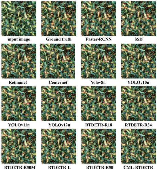 In order to compare the detection effect of this paper’s model with the current mainstream target detection models for wheat ears in the field, the classical CNN-based detection models Faster-RCNN [], SSD [], Centernet [], and Retinanet []; lightweight CNN networks YOLOv8n [], YOLOv10n [], YOLOv11n [], and YOLOv12n []; and the Transformer-based network model RT-DETR series were selected in this paper. Table 1 shows the results of the evaluation metrics of the CML-RTDETR model proposed in this paper compared against other mainstream target detection models on the global wheat dataset, from which it can be seen that the parameter size of the CML-RTDETR model is 11.03 M, GFLOPs is 37.8 G,  is 52.7%,  is 90.5%, and real-time frame rate is 73 fps.