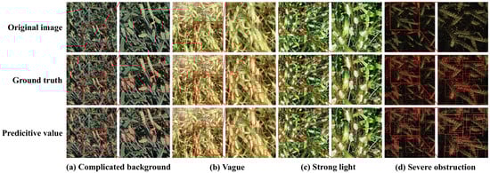 In order to deeply explore the influence of environmental factors on the detection accuracy of the model, this paper manually screened the wheat images under four typical field scenes, namely, complex background, blurring, strong illumination, and overlapping occlusion.