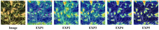 As can be seen from the table, after CML-RTDETR improved the original backbone network of RTDETR-improved CSPDarknet, the  and  results increased by 0.9 and 1.0 percentage points, respectively, and the model’s overall number of parameters and floating-point arithmetic were reduced by 16% and 11%. On this basis, the number of parameters only increased by 0.32 M after adding the multi-scale feature enhancement pyramid, but the  and  improved by 0.3 and 0.5 percentage points, respectively. In addition, there was a 0.6 percentage point improvement in the detection accuracy metrics for the  on small targets, a 0.5 percentage point improvement in the  on medium targets, and a 1.2 percentage point improvement in the  on large targets, which verifies that the multi-scale feature enhancement pyramid proposed in this paper can improve the model’s detection ability on wheat targets of different scales. After replacing the CML_loss function, the  and small-target  were improved by 0.1 and 0.9 percentage points, respectively, while the number of parameters was kept constant. Since the model in this paper considered the loss in accuracy for small targets after lightweighting, the final model improved the detection accuracy index  by 1.2 percentage points to 90.5% and the  by 1.5 percentage points while reducing the number of parameters in the model. These results prove the effectiveness of the improved module in this paper. In order to verify the effectiveness of the improved module more intuitively, this paper utilized a heat map to embody the network’s ability to capture the target features of wheat ears, gradually adding each module adopted in this paper under the benchmark of RT-DETR and comparing the results with the original RT-DETR. The experimental results in Figure 10 show that the original RT-DETR focuses attention on wheat ears, the wheat ear pole diameter, and part of the background, whereas the CML-RTDETR favors attention more toward wheat ears and reduces the degree of attention on the background and wheat ear pole diameter.