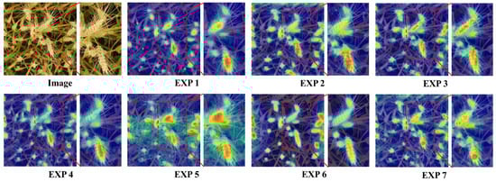 From the experimental results in the table, it can be seen that even without introducing the loss function we designed, this model was still able to maintain a high level of focus on the target area; however, when encountering background occlusion areas, there were cases where the model incorrectly identified the occlusion areas as the target areas. Different weight values were found to have different impacts on the performance of the model. When the weight value  of the loss functions of  and NGWD is 0.8, the performance of the model reaches its peak. Under this configuration, the model takes into account the needs of small-target detection and multi-scale target detection; the detection accuracy of each category was improved, and the AP50 reached the highest value of 90.6. As can be seen from Figure 11, under this configuration, the model paid the closest attention to the target, and the interference from the background was the least. Therefore, in this paper, the weight value  of 0.8 was used to combine these loss functions to obtain the best model performance.