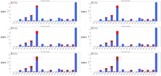 Table 7 shows the changes in the performance metrics under different pruning rates. It can be observed from the experimental data that as the pruning rate increased, the number of parameters and GFLOPs of the model showed a decreasing trend, which is consistent with the expectation of model lightweighting. Notably, the real-time performance (fps) of the model presented a non-linear variation: It increased from 56 fps of the base model to the highest 73 fps when the pruning rate was 1.4 and then decreased slightly with the further increase in the pruning rate. This indicates that an appropriate pruning rate can effectively reduce redundant computations and improve the inference speed, but excessive pruning may damage the integrity of the network structure, leading to a slight decline in real-time performance. In terms of detection accuracy, when the pruning rate was 1.2 and 1.4, key metrics such as ), , and  remained basically stable compared to the base model, with no significant loss. However, when the pruning rate reached 1.6 and above, indicators like  and  showed a noticeable decline, which may be due to the excessive removal of channels related to important feature extraction, affecting the model’s ability to capture target information. Furthermore, as shown in Figure 12, analyzing the changes in the number of channels in each layer of the network before and after pruning, the proportion of output channels decreased with increasing pruning rate, while the backbone network (layer indices 1 to 8) showed no significant changes. This indicates that the shallow layers have low redundancy, while the deep layers exhibit more parameter redundancy, and pruning can remove these redundant parameters without significantly affecting the overall network performance.