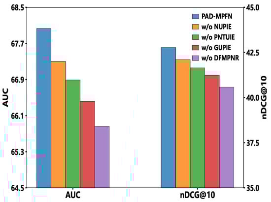 We conduct systematic ablation experiments to evaluate the contribution of PAD-MPFN’s core components: (1) the neighbor-based user potential interest encoder (NUPIE), (2) the popularity-normalized and temporal-aware user interest encoder (PNTUIE), (3) the graph-based user potential interest encoder (GUPIE), and(4) the dynamic fusion mechanism for personalized news recommendation (DFMPNR). Following the architecture outlined in Algorithm 1, we evaluate four configurations: