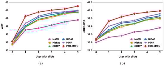 In news recommendation systems, cold-start users are typically defined as those with limited historical interactions, making it challenging to infer their preferences accurately. Following Ding et al. [29], we categorize cold-start users as those with fewer than five clicks in user-level cold-start scenarios. To evaluate the performance of different recommendation methods under such conditions, we conducted experiments on the Mind-small dataset.Since users with zero historical clicks lead to excessive noise in the training process of all models, resulting in poor performance, we focus on cold-start users with 1 to 5 clicks. As illustrated in Figure 4, our proposed PAD-MPFN model outperforms all baseline methods across the range of 1 to 5 clicks.