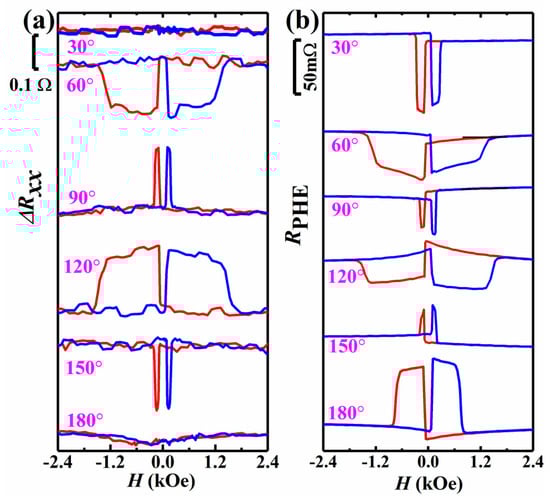 In-plane angular dependence of ΔRxx-H (a) and RPHE-H (b) loops at 10 K. The red and blue traces indicate different sweeping field directions (red: decreasing H; blue: increasing H). The vertical scale bars for (a,b) are different due to drawing limitations.