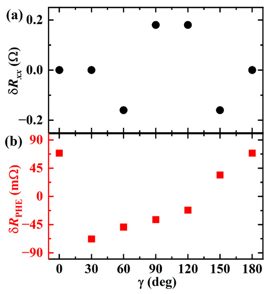 Figure 2 shows the γ-dependent magnetotransport behavior (ΔRxx-H and RPHE-H) of the Pt/TmIG bilayer at 10 K. From the in-plane angular dependent ΔRxx-H curves (Figure 2a), it can be seen that for γ = 30° and 180°, the magnetoresistance effect is almost negligible. As for other angles, the ΔRxx-H plots exhibit an MR curve with double switching, meaning the occurrence of ΔRxx plateaus at intermediate H that are distinct from high field situations; the amplitude of Rxx variation (δRxx) is almost constant (~0.16 to 0.18 Ω). We are not aware of reports about such an MR behavior in the HM/FI bilayer. For the PHE curves (Figure 2b), two switching loops are always observed at different values of γ, accompanied by variation in coercivity. This behavior is attributed to the magnetic anisotropy of the TmIG film [6,9]. The angular dependence of δRxx is shown in Figure 3a. The sensitivity of δRxx to γ, leading to both negative and positive MR effects, can be observed in this HM/FI heterostructure. Moreover, the magnitude and sign of the δRPHE are also dependent on γ. Figure 3b shows the γ dependence of δRPHE, which decreases and changes sign around γ = 30° and then increases with γ and reaches +69 mΩ at 180°. This MR effect with obvious positive and negative changes is very conducive to the design and application of new memory devices.