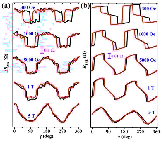 The dependences of ΔRxx and RPHE of the Pt/TmIG bilayer with γ at 10 K are plotted in Figure 4, with γ sweeping from 0° to 360° (black curves) and then back to 0° (red curves). At low field (H = 300 Oe), hysteresis with abrupt transitions is observed in ΔRxx-γ and RPHE-γ curves at γ = 90°, 135°, 270°, and 315° due to the switching of magnetization between magnetic easy axes, indicating the presence of magnetic anisotropy in TmIG. In the TmIG structure, its magnetic moment consists of two Fe3+ sublattices and one Tm3+ sublattice [21,22]; thus, these transitions may originate from the magnetization switching of these magnetic sublattices. The angular dependence of the width of both hysteresis of ΔRxx and RPHE systematically decreases with increasing magnetic field and then disappears when H is up to about 1 T. At H = 5 T, both angular dependences of ΔRxx and RPHE show non-hysteresis behavior, and the maximum ΔRxx is found at 0° and 180°, indicating that the resistance of the current parallel to the magnetic field (direction of the magnetization of TmIG) is larger than that of the current perpendicular to the magnetic field. While for RPHE, it exhibits extrema for applied magnetic field orientations around 45°, 135°, 225°, and 315°, which is consistent with Equation (1).