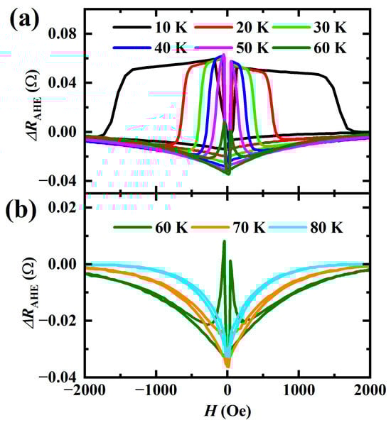 As for the magnetic field dependence of PHE, the ΔRPHE-H curve shows up-switching apart from the two down-switching at 30 K (Figure 6b), which becomes more obvious with increasing temperatures (Figure 6c). It is worth noting that four switching instances are found between 40 K and 70 K, which have not been reported in other Pt/REIG systems. And with further increases in temperature, the ΔRPHE-H curves show the butterfly-like shapes in Figure 6g,h, which are similar to the ΔRxx-H curves.
