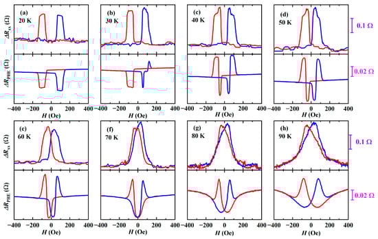 As for γ = 90°, the PHE and MR effects of Pt/TmIG show complex behavior (Figure 6). With the temperature increasing up to 60 K, the ΔRxx-H curves still exhibit an MR curve with double switching (Figure 6a–e), similar to that observed in Figure 2a. When the temperature is above 60 K, the shape of ΔRxx-H curves (Figure 6f–h) becomes butterfly-like, which is similar to other Pt/ReIG bilayers [15]. These results further confirm that the magnetoresistance (MR) curve with double switching in Pt/TmIG only occurs at low temperatures, which likely results from the contribution of Tm3+.