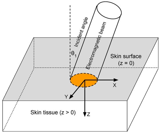 In (17), denotes the mass density, the specific heat capacity, and k the heat conductivity of the skin. The quantity represents the power per unit area transmitted through the skin surface at the beam center. is the incident angle and is the refracted angle of the electromagnetic beam. is the skin absorption coefficient at the relevant electromagnetic frequency. (17) is the initial boundary value problem (IBVP) governing the evolution of the skin temperature .