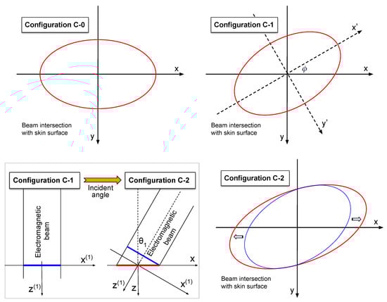 In configuration C-1, the beam intersection with the skin surface is the same perpendicular cross-section as in configuration C-0, except that it is rotated about the beam axis by an angle , as shown in the top-right panel of Figure 2. The rotation is clockwise about the positive z-axis (into the page). The power density and the -maximum contour remain unchanged in the local coordinate system attached to the beam. The global coordinates and the local coordinates are related by the following transformation:
