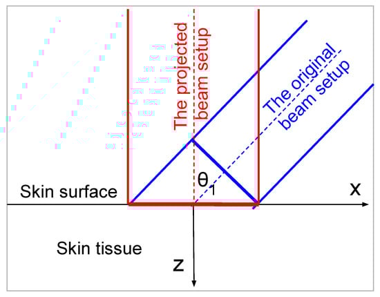 The two beam setups are illustrated in Figure 3. The original beam setup and the projected beam setup have the same projected power density on the skin surface. The original setup is at an incident angle, while the projected setup is perpendicular to the skin surface. However, they are not equivalent. The effect of the incident angle extends beyond merely influencing the power density projected onto the skin surface. In Snell’s law, the incident angle determines the angle of beam propagation inside the skin tissue, which in turn affects the power absorption, and the corresponding heating source in the skin.