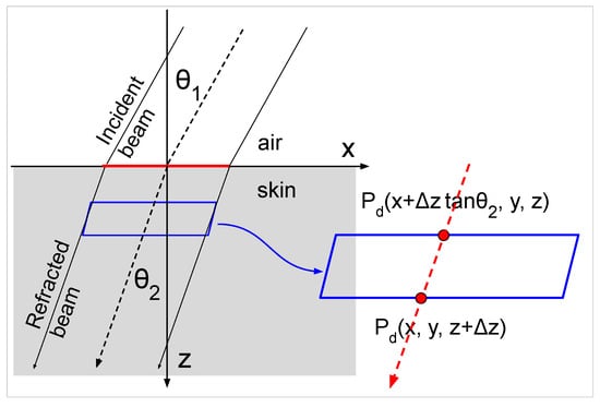 Let be the fraction of the incident beam power that passes through the skin surface (the remaining power is reflected). The power density passing through the skin surface is therefore given by []. Let denote the angle of refraction, defined as the angle between the z-axis and the direction of beam propagation inside the skin (see Figure 4). The incident angle and the refracted angle are related by Snell’s law: