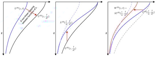 Scaling law (31) corresponds to the mapping from to in (27). Note that and at time are mapped to and at time t. When we compare and at the same time level t, we need to view (27) as a mapping between two functions of z, instead of a mapping between two functions of . Specifically, we view it as a mapping from (a function of z at time t) to (a function of z at time t). We dissect the mapping from to into three steps below: