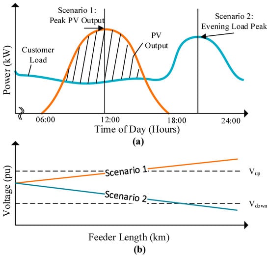 (a) Time series variation in load and PV output. (b) Voltage profiles in a typical LV feeder.