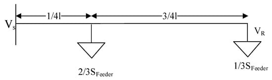 For the formulation of measuring the level of deviation in voltage levels along a feeder, an “exact” lumped load model is used ref. []. Assuming that loads are uniformly distributed, this model lumps the load into two segments, simplifying the network to calculate the approximate voltage deviation in the feeder. Figure 2 depicts the single-line diagram of a model described in ref. [], where a distribution network feeder with multiple nodes can be modelled by placing two-thirds of the total apparent power (measured at the LV transformer) at 0.25 l, where l is the total length of the feeder, and the remainder is placed at the end of the feeder. Here, vs. and VR are the sending and receiving end voltages of the feeder, respectively.