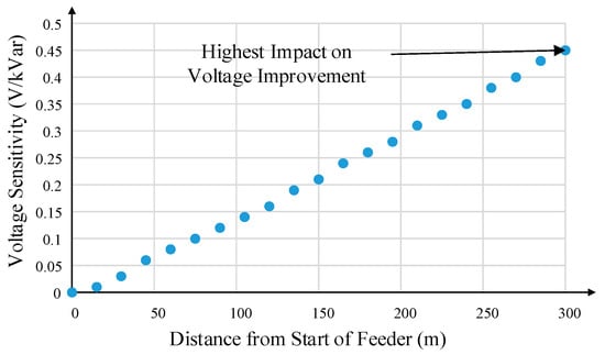 where the sub matrices [Sδp] and [Sδq] are the bus angle sensitivities with respect to active and reactive powers, respectively, and [Svp] and [Svq] are the corresponding sensitivities associated with bus voltage magnitudes. The well-known sparse-matrix optimizations can be used in the simplification of calculations. From Equation (6), the elements of [Svq], which can be interpreted as the magnitude of voltage change for the particular node per unit change in reactive power, are the key parameters in terms of the placement of the STATCOM. Figure 5 shows the sensitivity of voltage magnitudes to reactive power for the 300 m long LV feeder (introduced in Section 4), which is used in the case study presented in this paper. The conductor used for forming the network had a positive sequence resistance and reactance of 0.583 Ω/km and 0.352 Ω/km, respectively. The voltage sensitivity magnitudes were obtained via the Perturb and Observe method proposed in ref. []. A small Q was injected at each bus, and the ratio of the ΔVFeeder and Q injected was calculated.