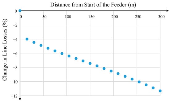 To investigate the variation in feeder line losses depending on the location of the STATCOM, a 24 h time series simulation with varying loads and PV output was undertaken. The details of the simulation parameters are presented in Section 4. Figure 6 shows the overall percentage change in line losses (I2R) for the time series simulation as the STATCOM is placed in different positions along the feeder. In Figure 6, a negative value corresponds to an overall increase in losses. The placement of the reactive power device at the end of the feeder increases line losses by 11% compared to not using a STATCOM. Considering that the main purpose of the STATCOM in LV distribution networks is to improve the voltage levels, it was decided to place the STATCOM at the end of the test feeder.