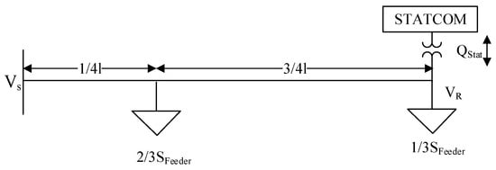 To calculate the correct sizing of the STATCOM, Equation (3) derived for VFeeder in Section 2 can be applied. With the STATCOM placed at the end of the feeder, the updated model of the feeder is shown in Figure 7.