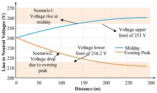 Figure 8 shows the voltage profile along the feeder for the two scenarios. In both scenarios, the voltages towards the end of the feeder can be seen to be outside the allowable range.