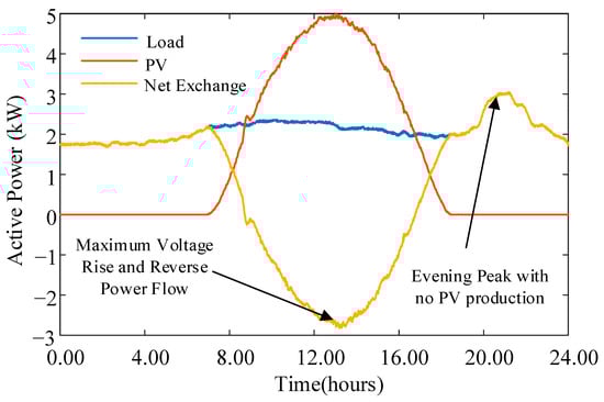 The load was operated at a lagging power factor of 0.95, and the PV system was generated with respect to the unity power factor to ensure the maximum utilization of the renewable energy source. The two extreme scenarios considered to investigate the maximum voltage deviations are identified in the plot, considering the net exchange of real power.