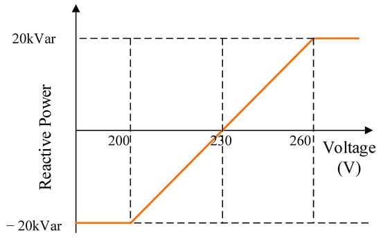 As the load and PV output vary throughout the day, the reactive power from the STATCOM needs to be regulated to control the voltage. A Q-V-based droop curve is utilized to regulate the amount of reactive power injected or absorbed by the STATCOM. The maximum reactive power to mitigate voltage deviations was previously calculated to be +19.9 kVAr and −17.2 kVAr to manage the voltage within the stipulated limits. The rating of the STATCOM was therefore selected to be 20 kVAr. Given the relationship between the voltage deviation and the level of reactive power sourced or absorbed, the STATCOM is linear according to Equation (8), and a linear droop curve was utilized, with a nominal voltage of 230 V. Figure 11 shows the droop curve applied to regulate the amount of reactive power supplied by the STATCOM for the case study provided.