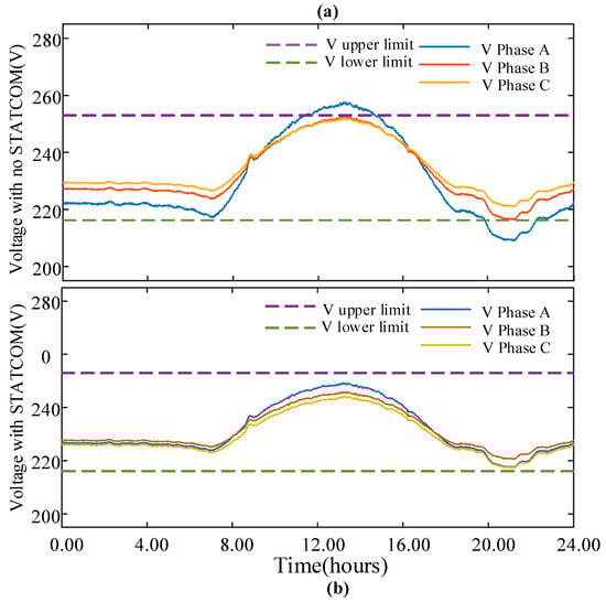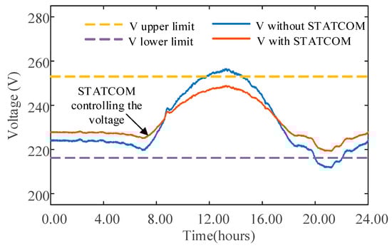 The maximum voltage observed is 259.2 V with maximum PV production, while the voltage decreased to 212.1 V during the maximum evening load. These values were used to calculate the amount of reactive power required to maintain voltage levels within the mandated limits using (8). For design purposes, the rating of the STATCOM was determined to reduce the voltage at the end of the feeder to 250 V for the voltage rise case and 220 V for the maximum voltage drop case, leading to a ΔVStat of 9.2 V and −7.9 V, respectively. For the feeder used in this case study, this resulted in an inductive reactive power requirement of 19.9 kVAr to mitigate the voltage rise and a capacitive reactive power of 17.2 kVAr to mitigate the voltage reduction. Figure 9 shows the improved voltage profile of the feeder with the STATCOM operating with these reactive power capabilities; it can be seen that the voltage is now within the prescribed range.