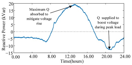 To mitigate long-term voltage regulation problems, common practice by DNSPs includes shortening LV networks by installing new distribution transformers and replacing transformers and cables with equipment of higher rated capacity and/or lower impedance (i.e., reconductoring). These solutions are generally expensive and require scheduled power outages. In recent times, researchers have proposed the use of energy storage devices (typically batteries) to regulate the flow of real power and ensure reduced reverse power flow and peak load shaving during evening peaks [,,,,]. However, even though prices are on the decline, wide adoption of battery energy storage for this application is still not economically feasible in practice. In addition to managing the dynamic nature of loads and maintaining the state of charge (SoC) of energy storage systems, power balancing algorithms are required, which involve sophisticated communication infrastructure that is not available in most electricity networks.
