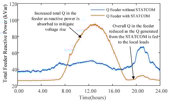 To evaluate the efficacy of the STATCOM, the performance of the system with and without reactive power regulation was investigated. Figure 14 shows the total three-phase reactive power of the LV feeder with and without the STATCOM. During the daytime, the solar PV output surpasses the load, and the overall Q in the feeder increases as the STATCOM absorbs reactive power to mitigate the voltage rise issue. Conversely, with no PV production, when the STATCOM generates Q to boost the voltage, the overall Q in the feeder decreases, as seen in Figure 14. Due to the operation of the STATCOM, at midday, the extra Q in the network increased the feeder’s rms current in phase A from 0.25 kA to 0.28 kA, a 12% increase in the peak current. However, during peak loads in the evening, the current in the feeder decreased from 0.29 kA to 0.27 kA, i.e., a 6.8% reduction.