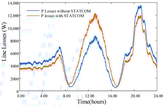 Figure 15 illustrates how the overall line losses varied throughout the day. Given that most residential loads operate with a lagging power factor, two main scenarios are introduced in terms of the line losses, with the application of the STATCOM: