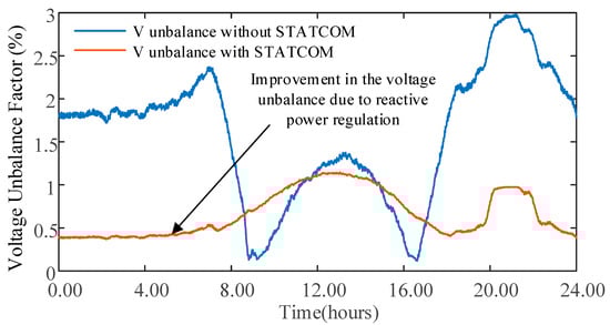 Figure 18 shows the variation in VUF measured at the end of the feeder. Due to the reduction in load and PV size in phases B and C, the maximum VUF is seen to be 3% with no STATCOM. Through the reactive power provided by the STATCOMs, as evident from Figure 18, the overall VUF of the system has decreased. With the STATCOM operating, the maximum VUF is reduced to 1%.