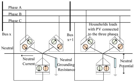 The impact of reactive power regulation on the neutral to ground (N-G) voltage in a four-wire MEN system is investigated in this section. If the currents are unbalanced, the resulting N-G voltage can become an issue of serious concern. In traditional distribution network analysis, the neutral conductor is often accommodated using Kron’s reduction technique or assumed to be solidly grounded. From a practical perspective, this assumption is not realistic, especially if there is high unbalance in the system. Figure 19 illustrates the basic connection philosophy of a MEN system.