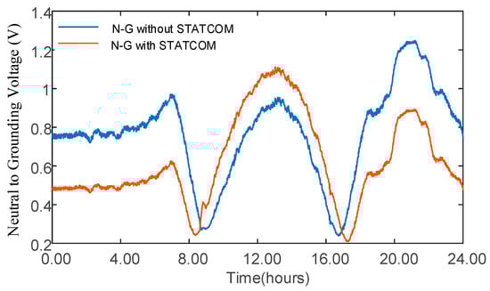 Interestingly, the N-G voltage of the system was observed to be higher during the daytime when the reactive power needed to be absorbed to mitigate the voltage rise issue. In this case study, the PV size for phase A is higher than for phase B, which, in turn, is higher than for phase C. This means that phase A’s current was higher at midday compared to the other two phases. With reactive power regulation, the STATCOM in phase A will absorb the higher Q compared to phases B and C, leading to higher unbalance in the system’s current. This leads to the N-G voltage’s increase due to an increase in the flow of the neutral current. This is demonstrated via the orange line, which plots the N-G voltage with the reactive power regulation applied. With no PV generation, however, the N-G voltage is lower when the STATCOM is operating due to a lower Q; hence, a lower current is observed in the system.