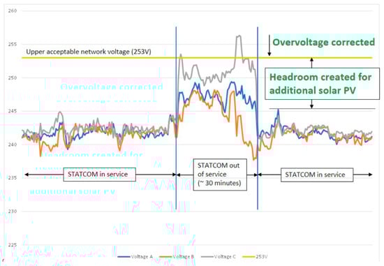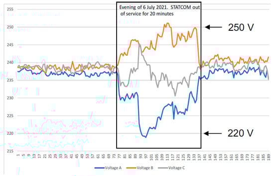 Figure 21 shows time series voltage data from a long rural overhead LV feeder that is approximately 750 m in length, supplying 61 customers—22 of whom have rooftop solar PV systems installed (~36% penetration). A 30 kVAr STATCOM was installed near the end of the feeder. The figure captures a brief 20 min period when the STATCOM was taken out of service. While the voltage remained within regulatory compliance limits, a clear deterioration in voltage regulation and an increase in phase imbalance were observed, highlighting the STATCOM’s ongoing role in maintaining tighter voltage control under dynamic conditions. To quantify the observed improvements, in Figure 21, the maximum voltage spread without the STATCOM was approximately 31 V (from 219 V to 250 V). With the STATCOM in operation, the voltage spread reduced to approximately 5 V—an 84% reduction in voltage variation. Similarly, the estimated voltage unbalance factor (assuming a 120° phase shift) reduced from 2.43% without the STATCOM to 0.37% with it—also an 84% improvement.